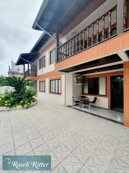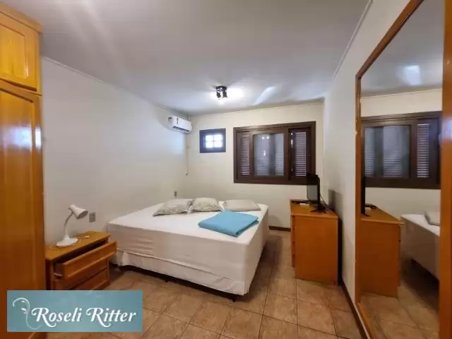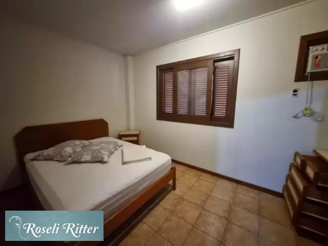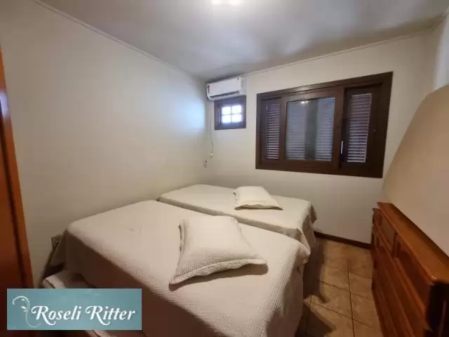 No 1° piso temos um banheiro social, uma suíte de casal, um quarto de casal, um quarto com duas camas de solteiro e duas auxiliares: Todos quartos com ar condicionado: Sacada com churrasqueira.