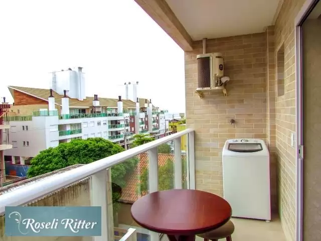 sacada com máquina de lavar. Cada apartamento recebe 2 cadeiras e 1 guarda sol.