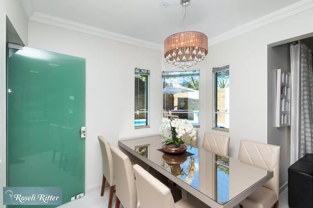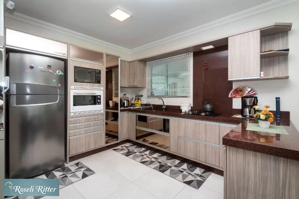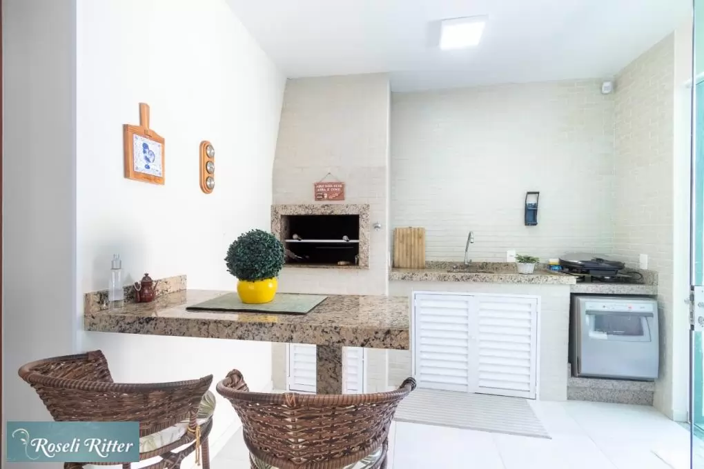 - Cozinha com móvel pré-moldado, completa (com microondas, forno elétrico, fogão de mesa, geladeira duplex, máquina de lavar-louça e demais utensílios de cozinha)
